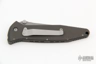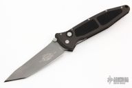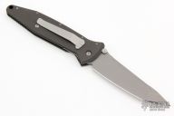 This Socom D/A Auto by Microtech features a clip point, compound ground blade.  The thumbrest is notched. The handle has a black aluminum frame with non-slip inserts and a tip down stainless steel clip.   Dated 6/97 and #678.  Has a couple scuffs, otherwise excellent condition.
