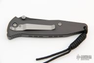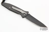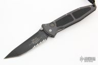 This Socom D/A Auto by Microtech features a black tanto blade with partial serrations and a notched thumbrest.  The handle has a black aluminum frame with non-slip inserts and a tip down stainless steel clip. Excellent condition. Dated 4/99. Comes with original hard display case and nylon sheath.  Excellent Condition.