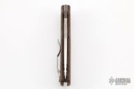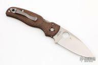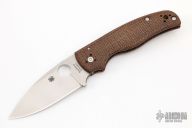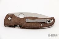 This Shaman Pin by Spyderco features a satin finished spear point blade with notched thumb and finger rests, thumbhole. The handle has brown burlap micarta scales, inlaid stainless steel liners and a satin finished stainless steel backspacer, 4-way reversible anodized titanium clip, lanyard hole at the butt. Comes with original box and papers. New condition.