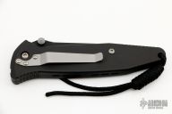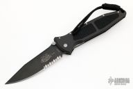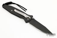 This manual Socom liner lock folder by Microtech features a black partially serrated blade with dual thumbstuds and notched thumbrest. The handle has a black aluminum frame with rubber inlays. Dated 10/98. Original box, sheath and papers. Excellent condition.