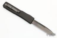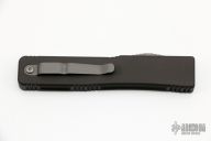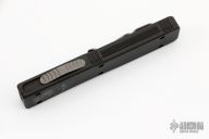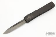 This Early Ultratech by Microtech Knives features a black tumbled drop point blade with swedge and fullers. The handle has a black anodized aluminum with ramped steel thumb slide and tip down clip.  Light scratches are visible on the blade otherwise the knife is in excellent condition. Includes the original box and papers.  S/N of 0386cand dated 09/2001.