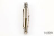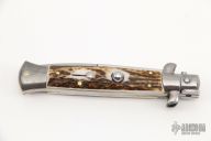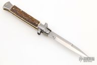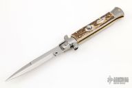 This 9" Picklock by Frank Beltrame features a polished bayonet ground blade with false top edge. The handle has stainless steel bolsters, front and rear, stag scales, brass liners, stainless spring. Excellent condition.