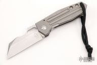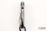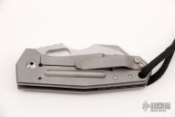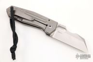 This CAMS Framelock by Steve Karroll features a satin finished blade with swedge, thumbhole and notcehd thumbrest. The handle has a milled and tumbled titanium frame, black G-10 backspacer. Titanium tip up clip and lanyard hole in pommel. Excellent condition.