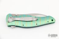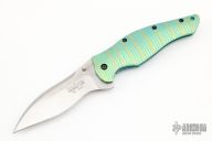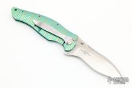 This Bump 1590GR (#0532) assisted opening flipper from Kershaw has a satin finished S30V stainless steel spear point blade with dual thumb studs. Handle is fluted green titanium, tip down stainless steel clip, and lanyard hole. Has some scuffs and scratches, great condition otherwise.