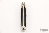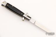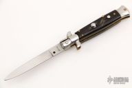 This Swivel Bolster Auto features a mirror finish spear point blade. The handle consists of stainless steel bolsters and buffalo horn scales over brass D-Stamp liners and stainless steel backspacer. Excellent condition.