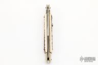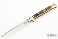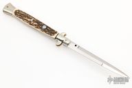 This 11" Picklock by Frank Beltrame features a polished bayonet ground blade with false top edge. The handle has nickel silver bolsters, front and rear, stag scales, brass liners, flat button, stainless spring. There is a small dent on the butt of the knife otherwise the knife is in Excellent condition.