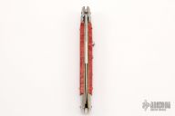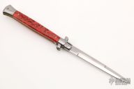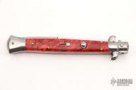 This 11" Swivel Bolster by Frank Beltrame features a polished ground blade with false top edge. The handle has stainless steel bolsters, front and rear, Amboyna burl scales, brass liners, stainless spring. Excellent condition.
