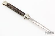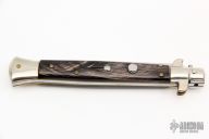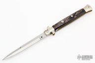 This 11" Picklock by Frank Beltrame features a polished bayonet ground blade with false top edge. The handle has nickel silver bolsters, front and rear, buffalo horn scales, brass liners, flat button, stainless spring. Excellent condition.