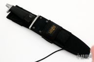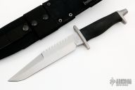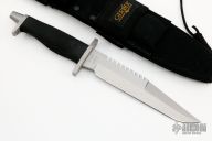 Hard to find sawtooth BMF by Gerber has been out of production for many years. Blade is bead blasted as are the guard and butt cap. .246" thick and 1.482" deep. Non-skid handle. Comes with original sheath, box and papers. Excellent condition. Highly desirable tactical knife. #004370. Has original Silva compass and diamond sharpening stone.