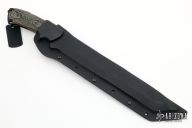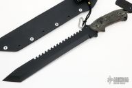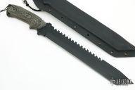 This knife has a black blade with saw teeth on the spine, .255" blade stock and 1.566" blade depth, full tang construction. The handle has black/green linen micarta scales with red liners. Comes with a kydex sheath. Excellent condition.