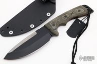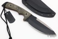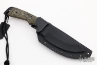 This Outpost Command from TOPS Knives features a black coated clip point blade with swedge and notched thumbrest, .253" blade stock and 1.936" blade depth, full tang construction. The handle is comprised of green linen micarta scales over red liners . Exposed tang pommel features multiple lanyard hles. Includes kydex sheath with belt clip. Has some staining on the blade, otherwise good condition.