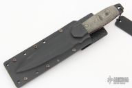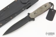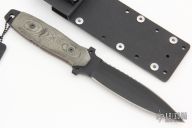 This knife has a black double edged blade with one partially serrated edge, .175" blade stock and 1.223" blade depth, full tang construction with black linen micarta scales and red liners. Comes with a kydex sheath. Excellent condition.
