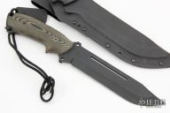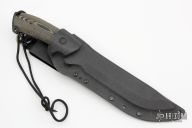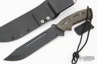 This knife has a black blade with cut out fullers, .257" blade stock and 1.536" blade depth, full tang construction. The handle has black/green linen micarta scales with red liners. Comes with a kydex sheath. Has a couple light scuffs, otherwise excellent condition.