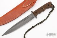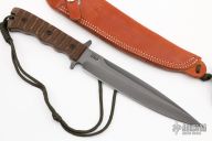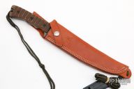 This Wild Pig Hunter by Tops Knives features a "black river wash" finished blade with false top edge, .245" blade stock and 1.309" blade depth, full tang construction. The handle has green canvas micarta scales with red liners. Comes with brown leather sheath.  Excellent Condition.
