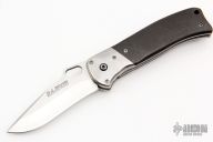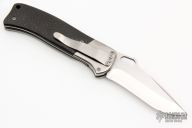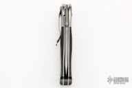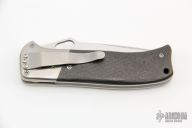 This Q-30 from RJ Martin features a satin finish drop point recurve blade with notched thumb ramp. The handle has titanium bolsters and liners, carbon fiber scales and a titanium tip down clip. Nice detent, lockup and blade seating.  Scratches are visible on the frame otherwise the knife is in excellent condition.