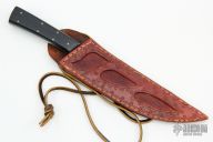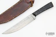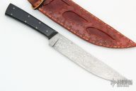 This sole-authorship knife by Marv Palmer features a Damascus blade with .158" blade thickness and 1.303" blade depth, full tang construction. The handle has black paper micarta scales with brass pins. Comes with a hand tooled brown leather sheath with exotic leather inlays. Has some light scratches and patina, otherwise good condition.