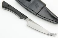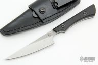 This Slim2None from Liontribe Designs features a "satin finished blade with "spiral" finished flats, .133" blade stock and .933" blade depth, full tang construction. The handle has black barbwire micarta scales. Includes a black leather sheath and COA. New from maker.