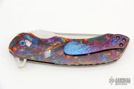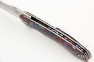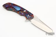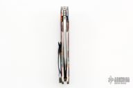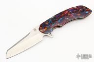 This custom Wayfarer flipper features a satin finished blade, notched thumbrest and hollow flipper. The handle has glossy new patchwork composite scales with entropic pivot, floating carved entropic backspacer, tip up titanium clip. Great action that requires no wrist movement. Nice detent and lockup. Comes with COA Dated 12/18/2020. W1234 inside backspacer. Excellent Condition.