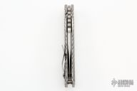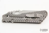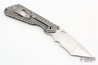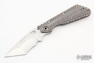 This Mick Strider custom XL framelock folder has a Rhino Yeti two-tone blade with notched thumbrest and thumbhole. The handle has a double gunner grip titanium frame with laser engraved titanium clip. Includes Hinderer "Lock Bar Stabilizer" for maximum reverse lock retention. Nice lockup, blade seating and detent. Comes with zippered case. From the 2022 California Custom Knife Show. New condition.
