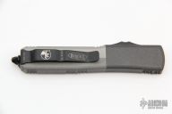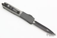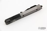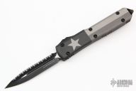 This Ultratech OTF automatic by Microtech features a D/E black blade with one fully serrated edge. Texas aluminum contoured frame with black hardware and tip down stainless steel clip. Dated 05/2022 and #176. Includes original box and papers. Excellent condition.