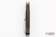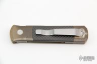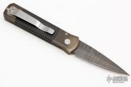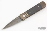This Godson from Pro-Tech Knives features a Ladder Damascus blade with swedge. The handle has a stonewashed bronze frame with a carbon fiber button, tip up clip.  Carbon fiber scales. Comes with original box and papers. Has some patina, otheriwse excellent condition.