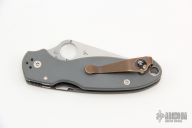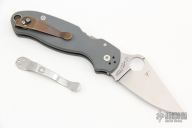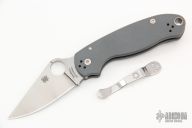 This Paramilitary 3 Linerlock Folder from Spyderco has a stonewashed finished clip point blade with thumbhole and notched thumb rest. Handle has grey G-10 scales with nested stainless steel liners and Lynch deep carry 4-way reversible clip. Comes with original clip, box and papers. Excellent condition.