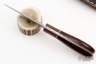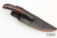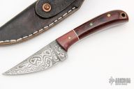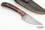 This fixed blade features an upsewpt Damascus blade with a full tang construction. .136" Blade Stock. 1.112" Blade Depth. The handle features dyed wood scales. Includes a black leather sheath. Excellent Condition.