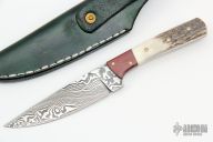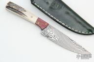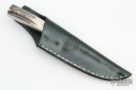 This hunter by Dr Good features a drop point Damascus blade with .148" blade stock and 1.276" blade depth, full tang construction. The handle has wood bolsters and stag scales. Includes a green leather sheath. Excellent Condition.