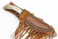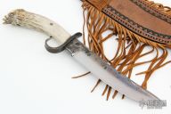 This knife by Jon P Moore features a blued blade with a hidden tang construction.  .247" Blade Stock.  1.495" Blade Depth. The handle has a steel guard with a crown stag grip.  Includes a brown leather sheath.  Has been resharpened.  Light sheathing marks are visible on the blade otherwise the knife is in Excellent Condition.