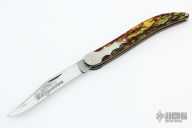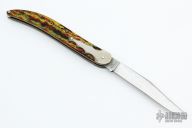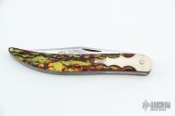This Barn Door Hinge slipjoint by Case features a mirror polished blade with nail nick. The handle has nickel silver "Barn Door Hinge" bolsters, acrylic "Christmas Tree" covers with white liners, brass liners and steel spring. Dated 1992. Comes with original box. Has some light scratches, otherwise excellent condition.