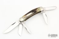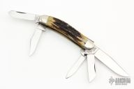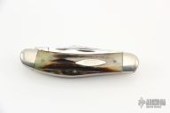 This Sowbelly by Case Knives features mirror polished blades with nail nicks. The handle has nickel silver bolsters, stag covers, steel springs with brass liners. Includes original box. Dated 1993. Has some light scratches and patina, otherwise good condition for a 30 year old knife.