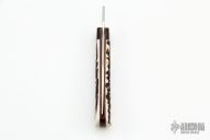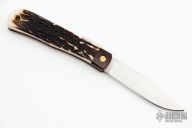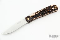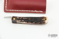 This friction folder by Yoshimi Kotoh features a satin finished blade with friction folder style opening. The handle has ironwood bolsters, stag scales and ironwood liners and trough, lanyard hole at the butt. Comes with a leather pouch. Excellent condition.