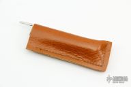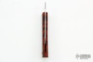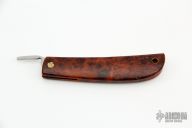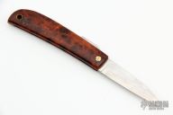 This friction folder by Yoshimi Kotoh features a San Mai Damascus blade with friction folder style opening. The handle is burl wood with a lanyard hole at the butt. Comes with a leather pouch. Excellent condition.