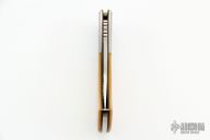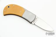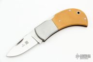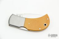 This Bull Dog by Al Mar Knives features a mirror polished blade with nail nick. The handle has stainless steel bolsters, yellow paper micarta scales, brass liners and a stainless steel backspacer, lanyard hole at the butt. Has some scratches, otherwise good condition.