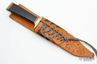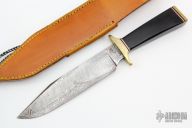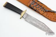 This knife by "RC"? (it think it is RC, let us know if you recognize this maker) features a Damascus blade with false top edge, .242" blade stock and 1.631" blade depth, hidden tang construction The handle has a brass guard and butt, black wood, black/red/nickel silver. Comes with a hand tooled brown leather sheath. Has a few light scratches, otherwise excellent condition.