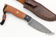 This knife by Bent Rivers Knives features a dark stonewashed blade with .127" blade stock and 1.134" blade depth, full tang construction. 61-62 Rockwell. The handle has black paper micarta bolsters, natural canvas micarta scales with brass and mosaic pins, black/blue G-10 liners, blue G-10 spacers, brass lanyard hole. Comes with a hand tooled brown leather sheath. New from maker.
