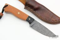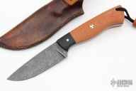 This knife by Bent Rivers Knives features a dark stonewashed blade with .121" blade stock and 1.157" blade depth, full tang construction. 61-62 Rockwell. The handle has black paper micarta bolsters, natural linen micarta scales with brass and mosaic pins, black/green G-10 liners, green/orange G-10 spacers, brass lanyard hole. Comes with a hand tooled brown leather sheath. New from maker.