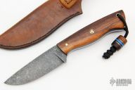 This knife by Bent Rivers Knives features a dark stonewashed blade with .121" blade stock and 1.167" blade depth, full tang construction. 61-62 Rockwell. The handle has desert ironwood scales with brass and mosaic pins, black/blue G-10 liners, brass lanyard hole. Comes with a hand tooled brown leather sheath. New from maker.