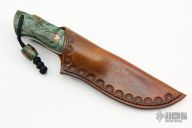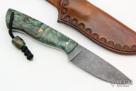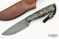 This knife by Bent Rivers Knives features a dark stonewashed blade with .121" blade stock and 1.167" blade depth, full tang construction. 61-62 Rockwell. The handle has stabilized maple burl scales with brass and mosaic pins, black/red G-10 liners, brass lanyard hole. Comes with a hand tooled brown leather sheath. New from maker.