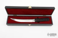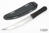 The Shinbu from CRKT features an upswept two-tone blade with polished flats and hand rub satin grinds. The handle is comprised of a decorative spacers and Japanese style wrap over black leather and hidden tang construction. Includes kydex sheath and wood presentation box. Excellent condition.
