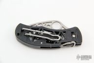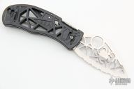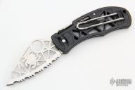 This Q Knife front-lock folder by Spyderco has a skeletonized satin finished stainless steel fully serrated blade with unique, clip-style front lock. Handle is black skeletonized polymer with 4-way reversible clip and lanyard hole. Excellent condition. Comes with original box and papers.
