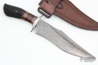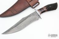 Another absolutely stunning piece from the Sobral brothers! This Fighter features a Random Pattern Damascus blade with false top edge, .261" blade stock and 2.30" blade depth, hidden tang construction. The guard is stainless steel with a beautiful wood grip, stainless and micarta spacers, premium stag butt. This piece comes in an equally impressive, hand tooled, brown leather sheath, frog, and a leather zippered case. New from maker.