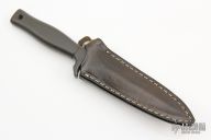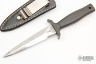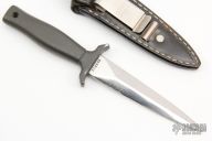 This Mark 1 dagger by Gerber is double-edged and high satin finished, .248" blade stock and .946" blade depth, hidden tang construction. Black coated aluminum handle. Comes with black leather sheath with boot clip. #003233. Has some scratches, has been resharpened, otherwise good condition.