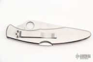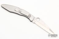This Police Lockback from Spyderco has a satin finished clip point blade with full serrations and thumbhole. Handle is stainless steel with stainless steel back spacer (lock), and stainless steel tip down clip. Has scuffs and scratches, otherwise good condition.