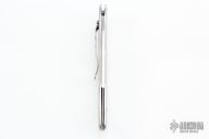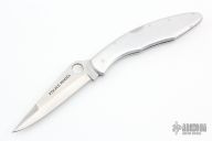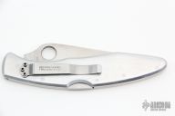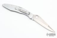 This Police Lockback from Spyderco has a satin finished clip point blade with thumbhole. Handle is aluminum with stainless steel back spacer (lock), and stainless steel tip down clip. Has scuffs and scratches, otherwise good condition.