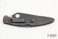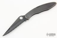 This Police Lockback by Spyderco has a black finished clip point blade with full serrations and thumb hole. Handle is black finished stainless steel with stainless steel back spacer (lock), and black stainless steel tip down clip. Has some light scratches, otherwise excellent condition.
