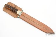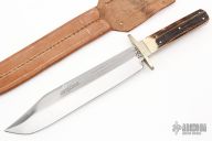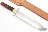 This Antique Bowie by George Wostenholm and Son features a satin finished blade with false top edge, .224" blade stock and 1.862" blade depth, full tapered tang construction. The handle has a nickel silver guard, stag scales and nickel silver pins. Comes with a brown leather sheath. Has some scratches and patina, otherwise good condition for its age.