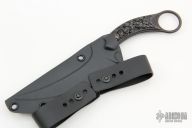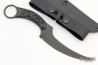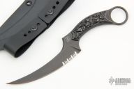 This Mako from Bastinelli Knives features a black finished upswept blade with partial serrations, .158" blade stock and .910" blade depth, full tang construction. The handle has bronzed skull scales with a one-inch finger hole on pommel. Includes kydex sheath. Excellent condition.