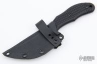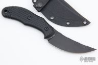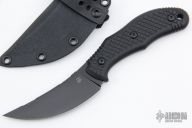 This Chopper by Bastinelli Knives features an upswept black blade with notched thumbrest and mortise tang construction.  .125" Blade Stock.  1.116" Blade Depth. The handle has black textured G10. Comes with kydex sheath with loop and a large hard case. Excellent condition.
