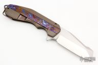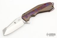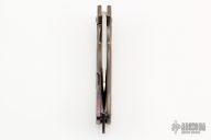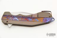 This Razoon from Jon Graham features a satin finish blade with flipper tab. The handle is comprised of an anodized and textured titanium frame with mokuti overlays, over a floating mokuti backspacer/glass breaker and lanyard hole. Anodize finished titanium pivot and tip up tail clip. Excellent blade seating, detent and lock up. Includes leather pocket slip. Has a couple light scratches on the blade, excellent condition otherwise.